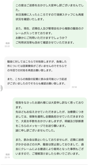 「騒音はこちらで対処する。負傷との因果関係はないので負傷の対応をして!飲み会OKと書いてるじゃん!」