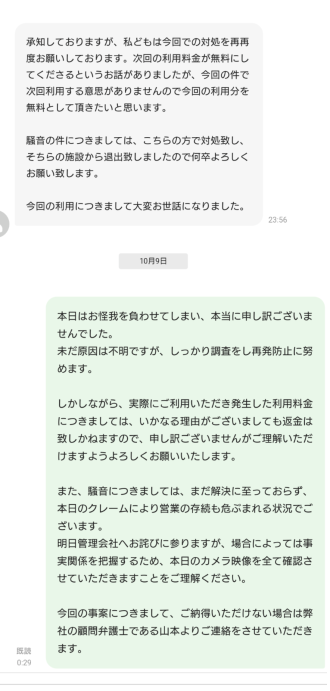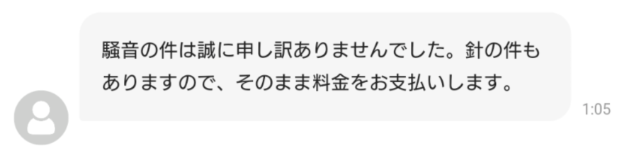 最終的に、ゲストは予約時間をフルに利用しつつ、「騒音についてはこちらで対処した。とにかく無料にせぇ!」 と言う言い分です。