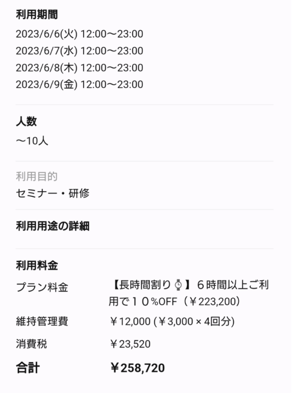 4日間の利用で258,720円など。