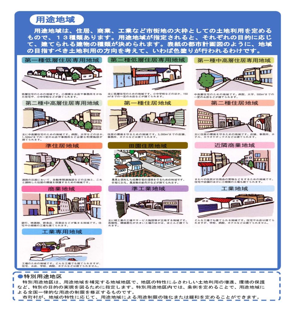 住居・商業・工業など13種類に分類されており、地域によって 建てられる建物や許可される用途が異なります。